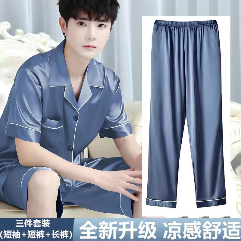 White Summer Three-piece Men’s Pajamas Short-sleeved Thin Ice Silk Youth Silk suit Pajamas for Men’s Summer
