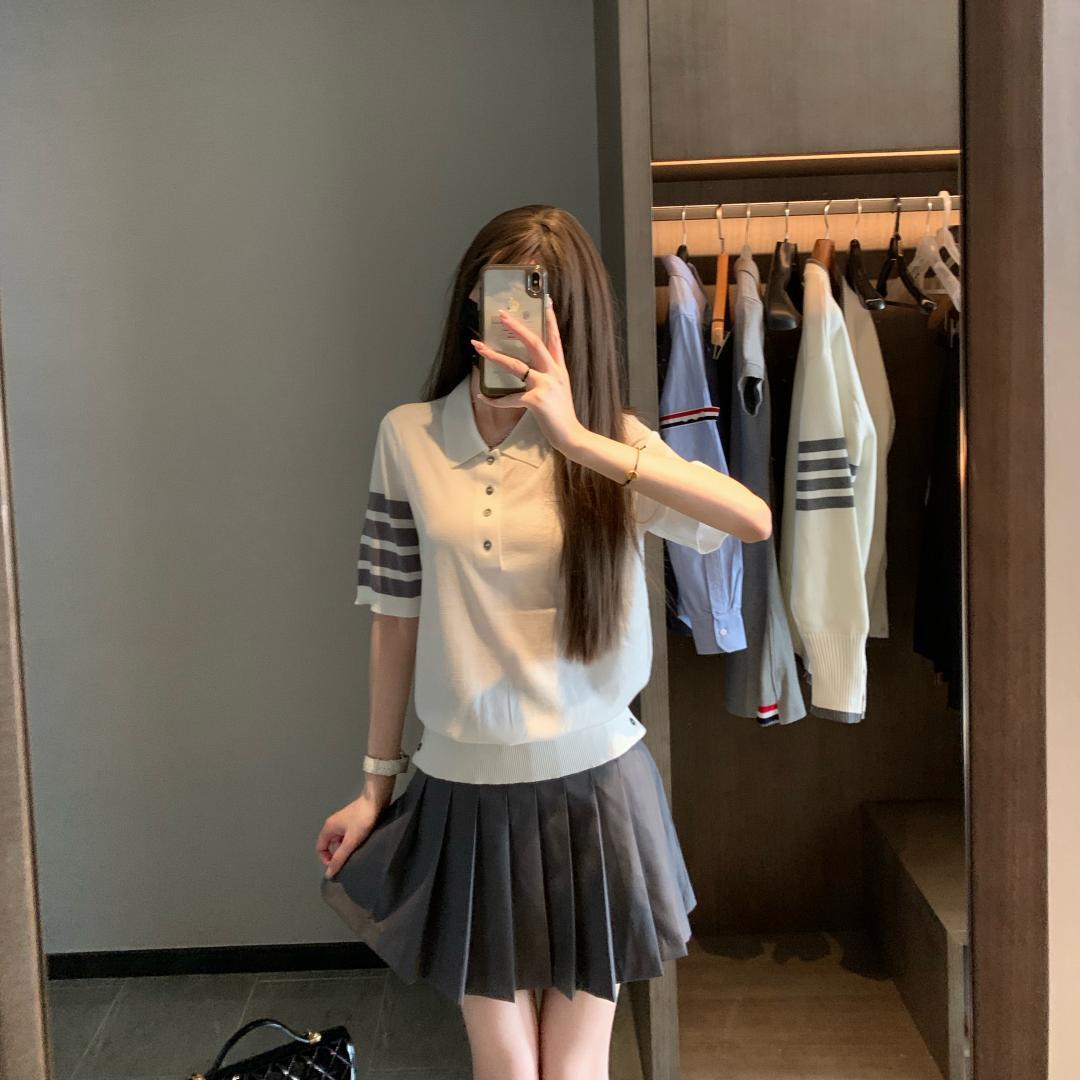 TB Women’s Summer Polo Collar Short-sleeved Top for Men and Women Classic Four-bar Ice Silk Polo All-match Basic Pleated Skirt