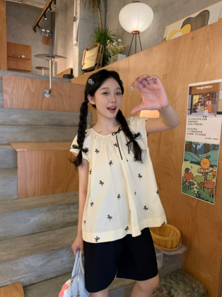 Bow tie short sleeve casual loose and gentle embroidery