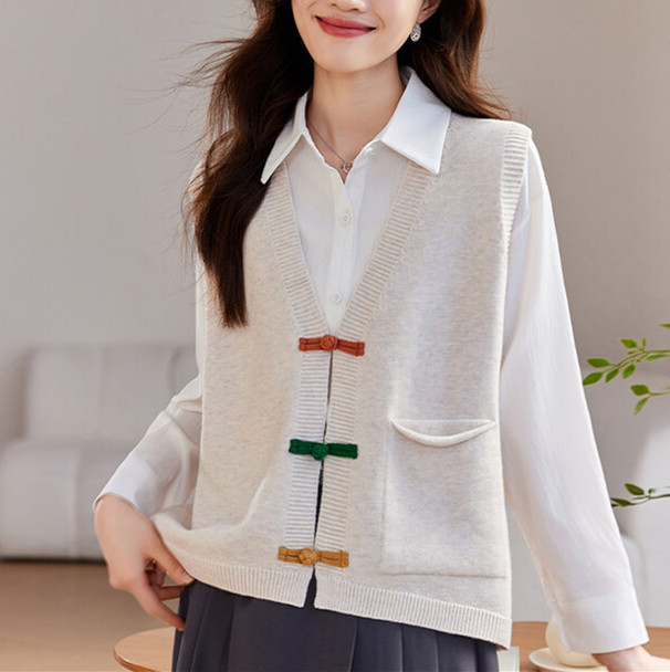V-Neck Knitted Vest Women’s Cardigan New Autumn and Winter Loose Slimming Color Buckle Sweater Vest Outer Wear Top