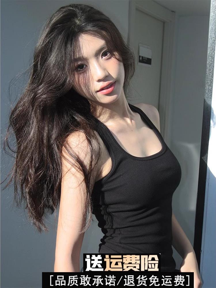 T European and American Spice Girls Black Camisole Women’s Spring and Summer Wear High Elastic Thread I-Shaped Sports Sleeveless Top