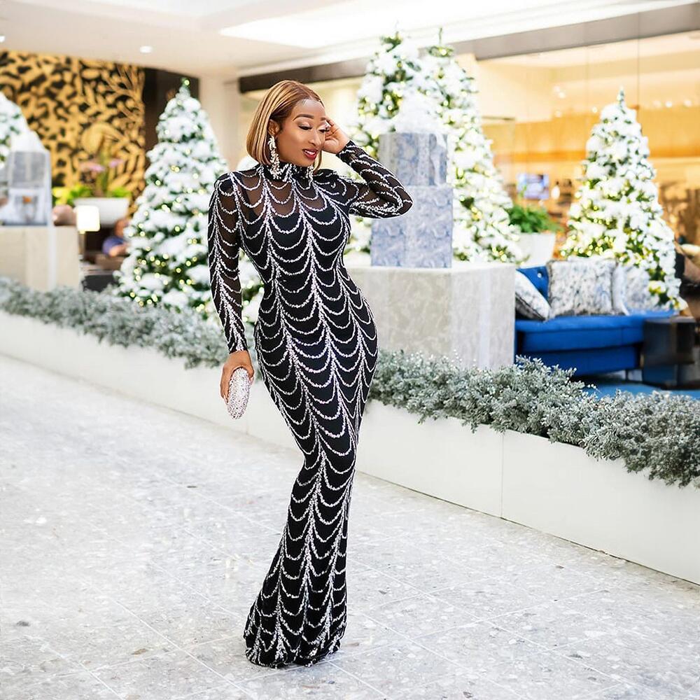 European and American African Dress Long Sleeve Evening Dress Stretch Beaded Fishtail Skirt with Inner Skirt Gold Silver