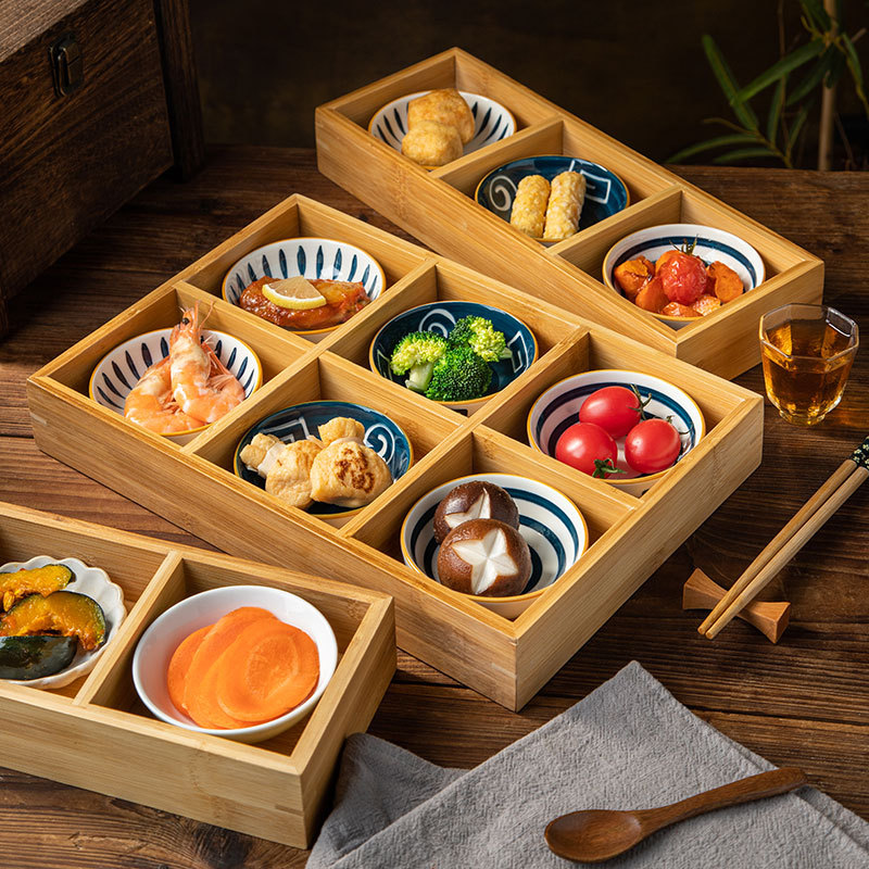 IJ6J wholesale bamboo wood Jiugongge hot pot platter side dish Seasoning snack ingredients compartment special rectangular tray