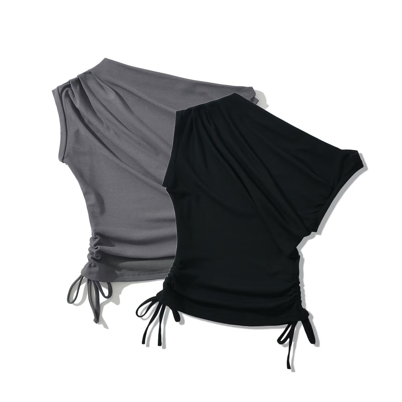 23 summer new women’s European and American fashion hot girl sexy drawstring pleated oblique collar short running casual one-shoulder T-shirt