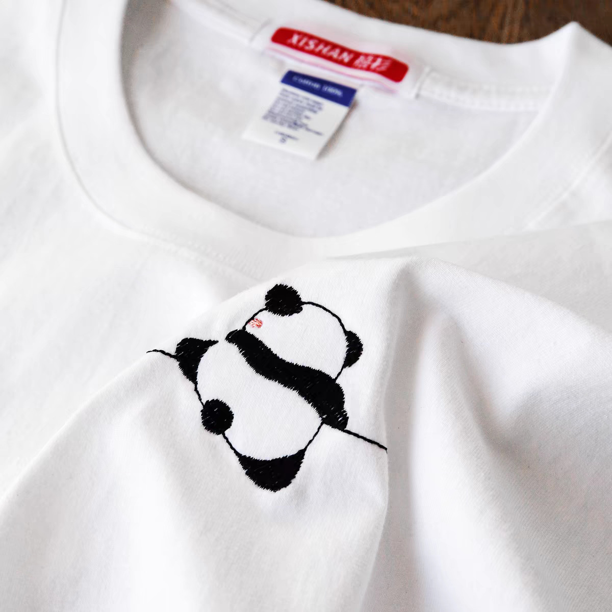 Cute Panda Flower Embroidered T-shirt Loose Simple Men and Women Couple High Texture Pure Cotton Top Base Shirt Shoulder