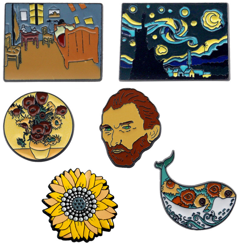 Creative Abstract Oil Painting Van Gogh Whale Shape Cute Metal Brooch Pin Sunflower Star Badge Trinkets