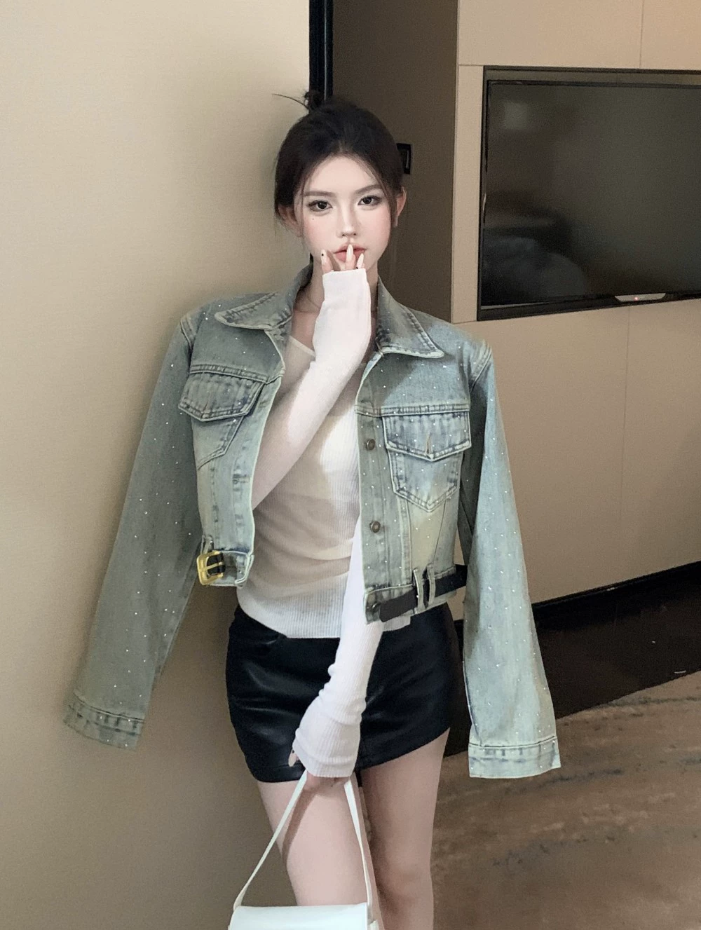 Fashion heavy industry diamond retro short denim jacket