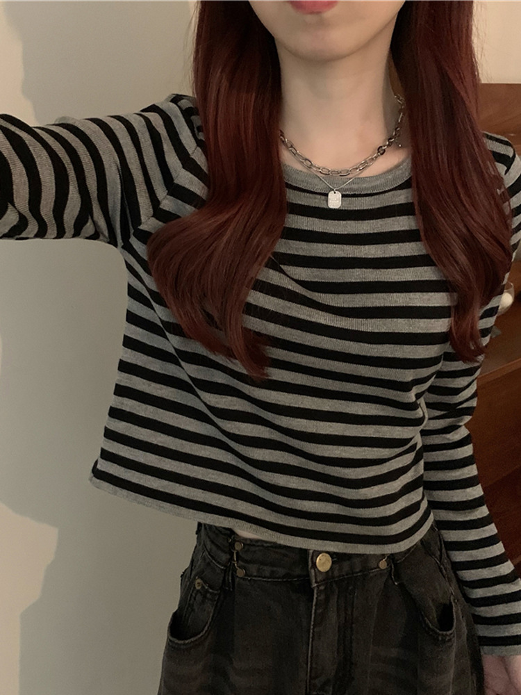 Striped long-sleeved T-shirt women’s spring, autumn and winter French chic bottoming shirt with short knitted casual all-match top