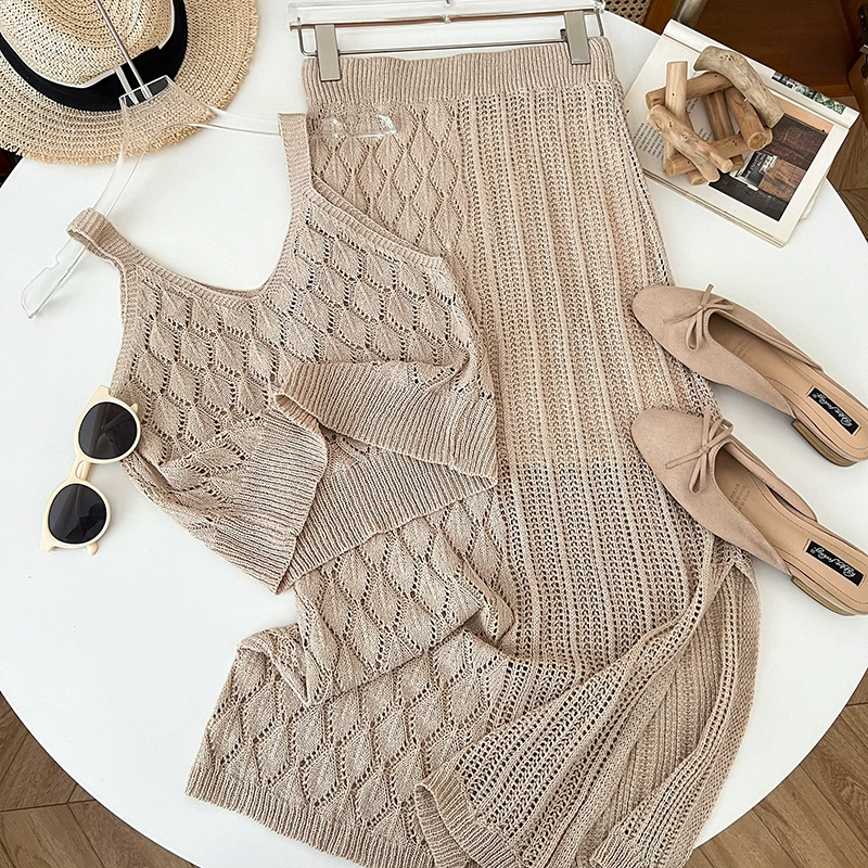 V -neck strap vest sweater top+high waist slim mid -length split skirt two -piece female summer summer