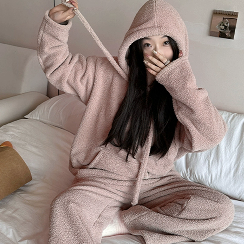 The new autumn and winter pajamas female plus velvet thick -sleeved long -sleeved hooded home service casual suit cat velvet can be worn outside