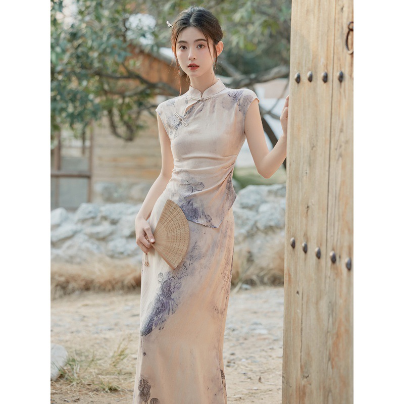 New Chinese Style National Style Ink and Wash Dye Cheongsam Top High Waist Skirt Set