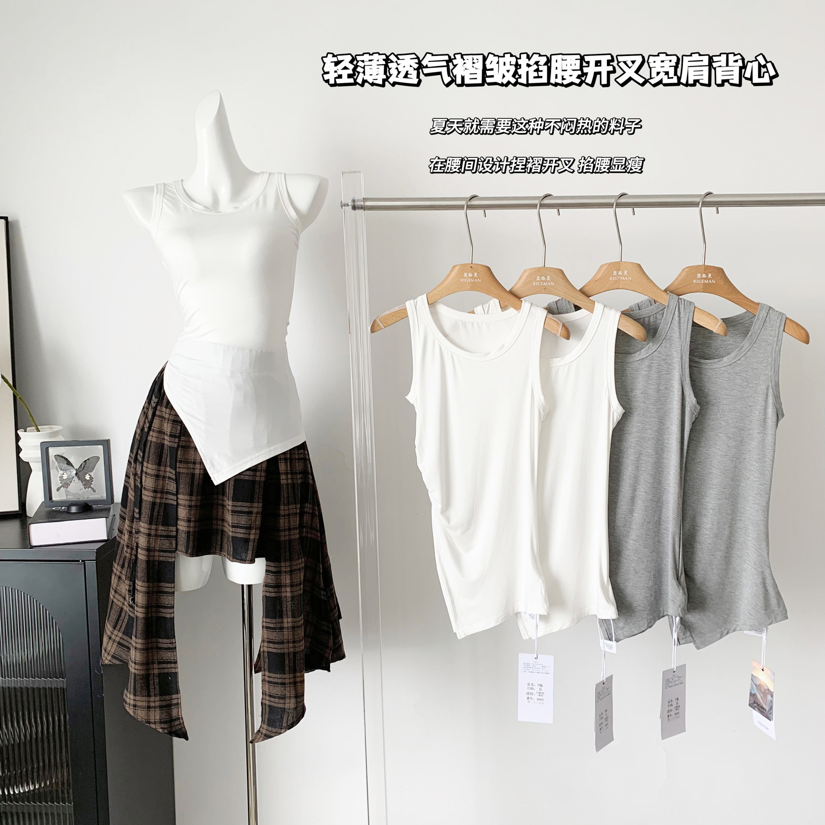 Lightweight Breathable Pleated Pinch Waist Split Wide Shoulder Vest Sleeveless All-match Outer Wear Vest Top