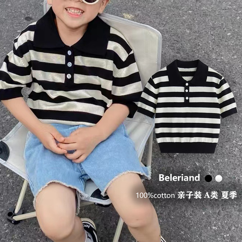 Class A Children’s Striped Polo Shirt 2023 Summer Wear Boys’ Short-sleeved T-shirt Breathable Girls’ Knitted Top Parent-child Cross-Border