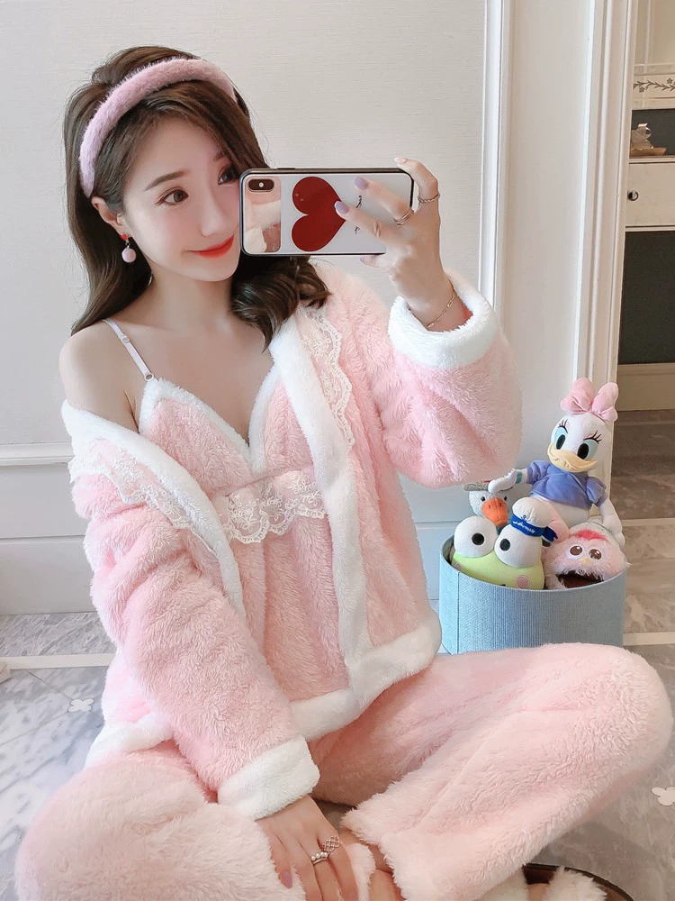 Coral velvet pajamas for women winter thickened plus velvet sexy flannel warm home clothes three-piece suit spring and autumn