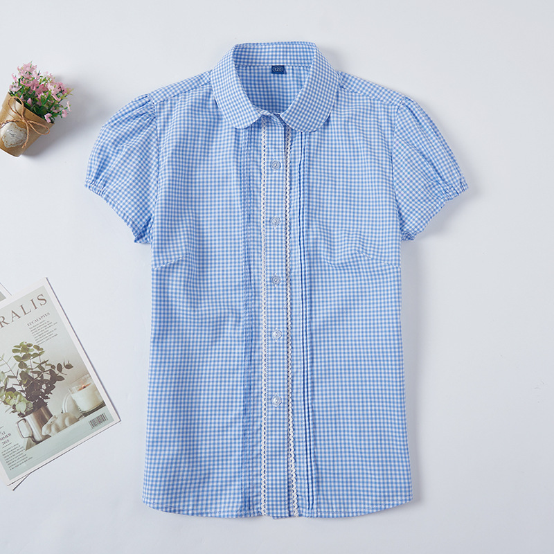 Summer girls’ blue and white plaid toothpick pleated lace stitching small round neck women’s short sleeve shirt puff sleeve shirt