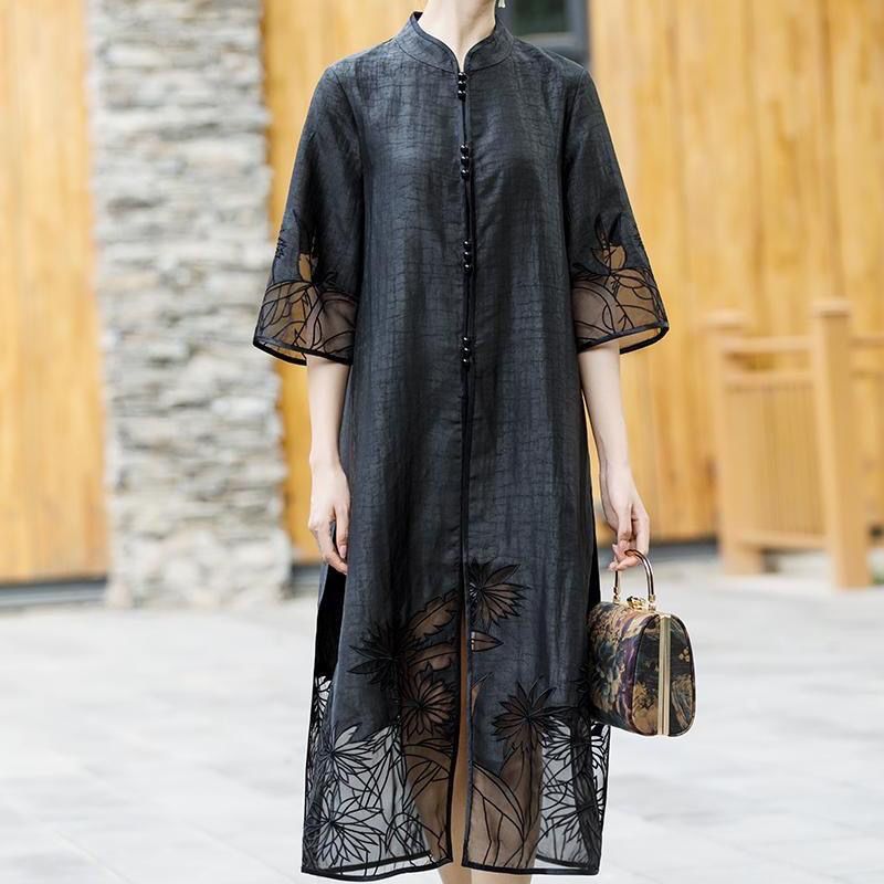 F Ming 3 Xiangyun Yarn Windbreaker Women’s Summer New Mid-Sleeve Coat Black Chinese-Style Collar Embroidered Hanging Long Outer Wearing