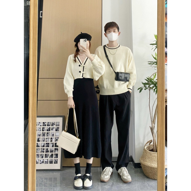 2023 autumn and winter French style Platycodon grandiflorum two-piece women’s sweater dress suit men’s round neck sweater couple wear