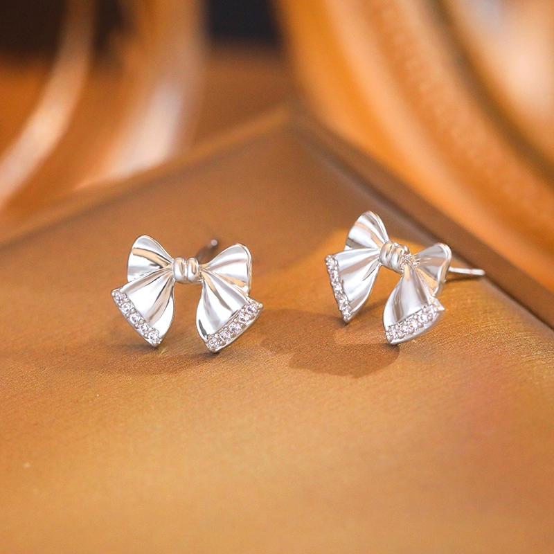 Ear Hole S999 Sterling Silver Needle Bow Earrings 2024 Autumn and Winter New Earrings Women’s Design Niche Earrings