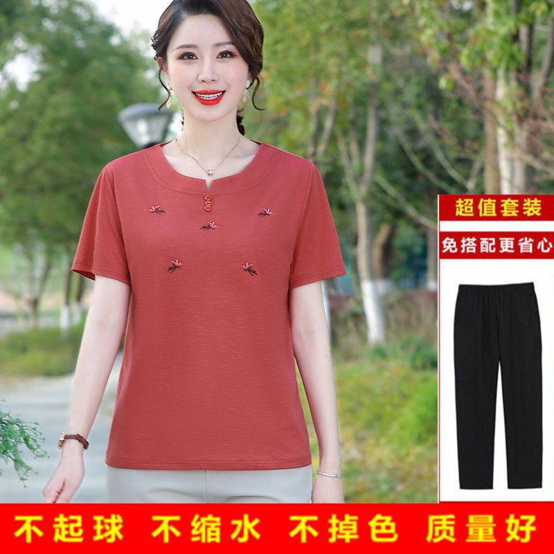 Mother’s Clothing Summer Western Style Fashion Round Neck Shirt Middle-aged and Elderly plus size Women’s Short-sleeved Slim-fit Thin Top