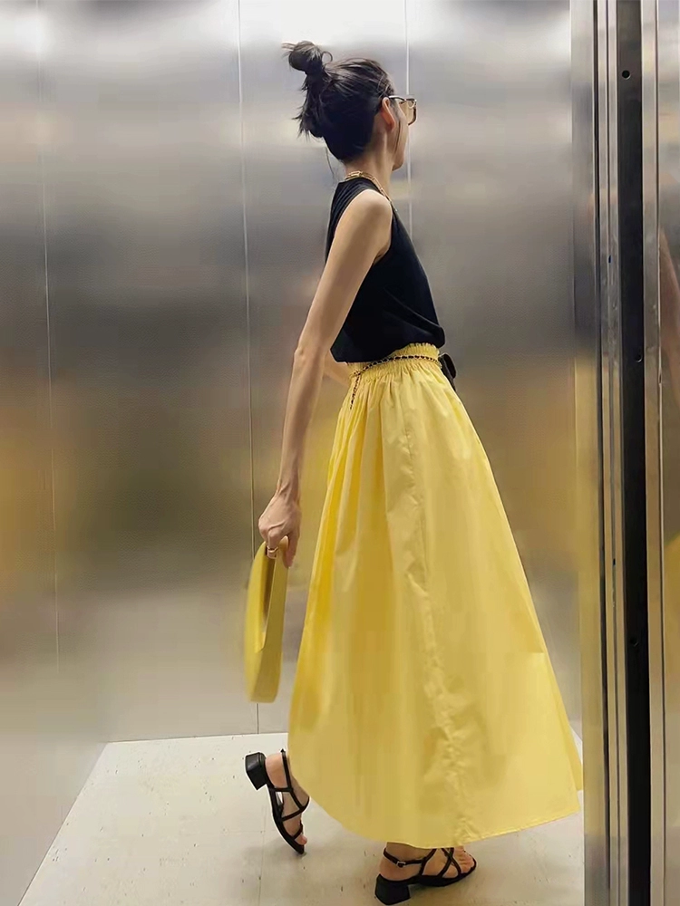Yellow female summer mid -length casual large skirt
