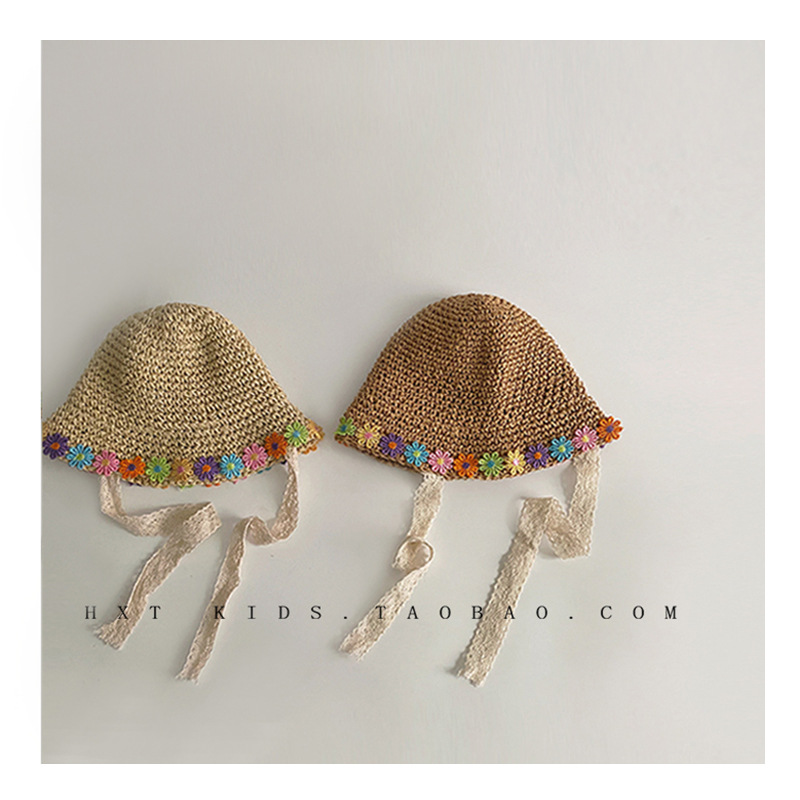 ins foreign style bucket straw hat ~ summer Children’s Outing sunshade lace-up sunscreen hat baby beach hat