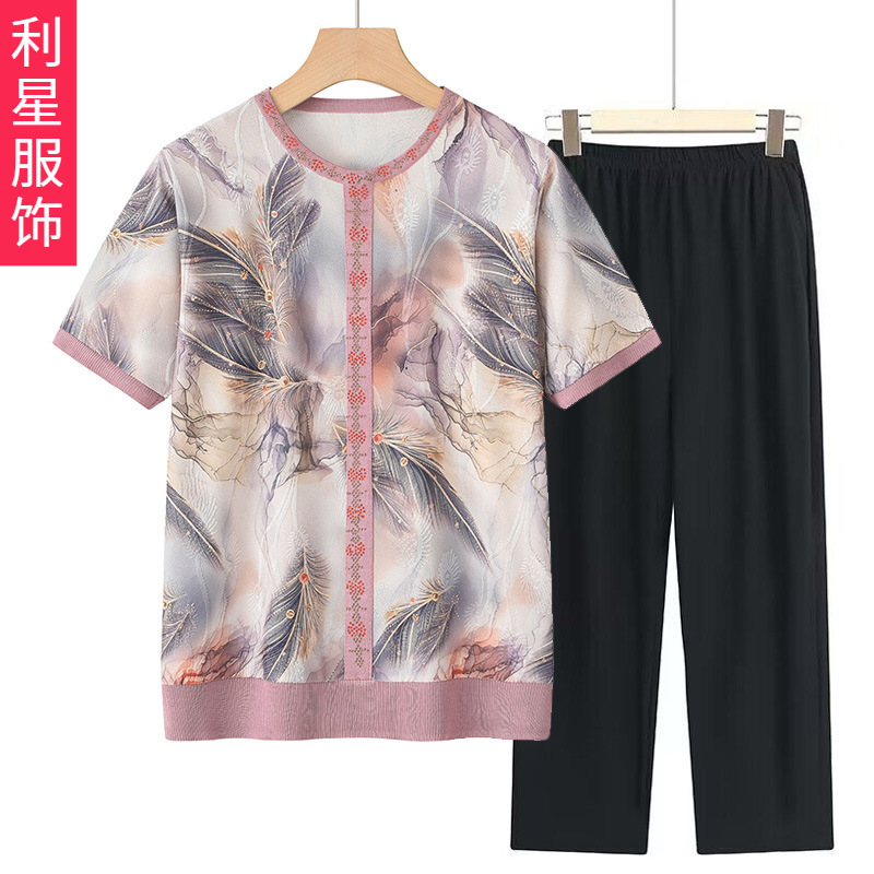 Mom’s Spring and Autumn Printed Small Shirt Stylish Women’s Summer Fashion Round Neck Base Shirt T-Shirt Top Middle-aged and Elderly