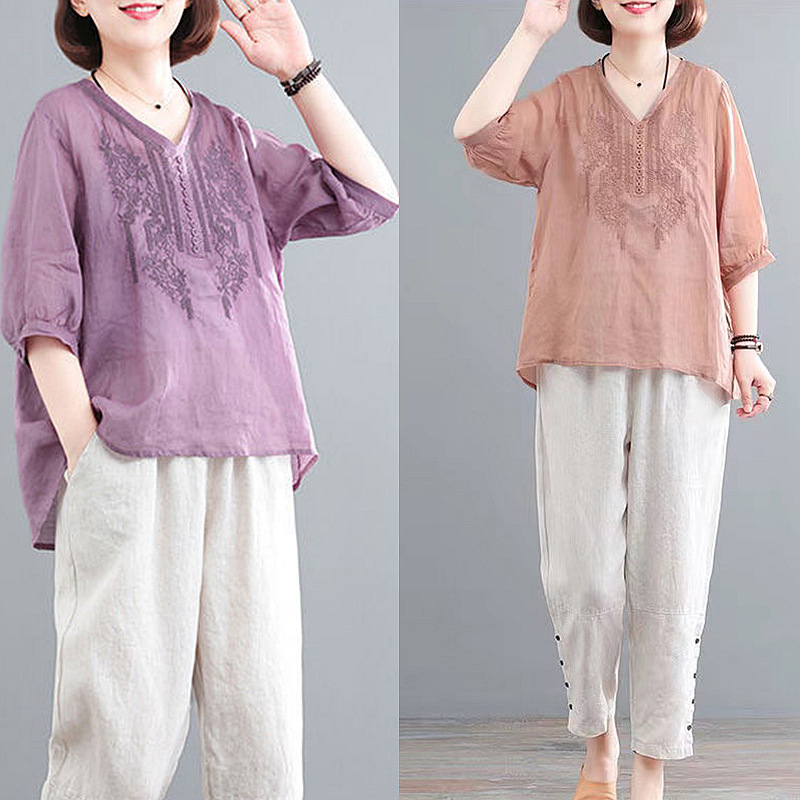 2024 Summer Korean Style Large Size Flesh-Covering Slimming Cotton and Linen Embroidered Top Linen Washing Pants Western Style Casual Suit for Women