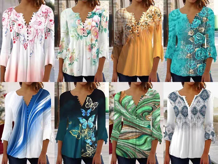 2023 European and American cross-border new spring and summer mid-sleeved V-neck slim-fit printed top for women