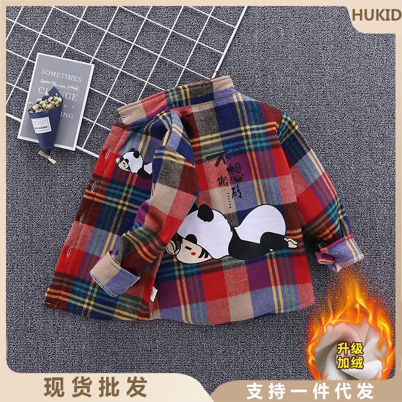 Boys’ Long Sleeve Shirt Plaid Baby’s Winter Top Children’s Cardigan Children’s Clothing Western Style Children’s Spring and Autumn fleece-lined Shirt