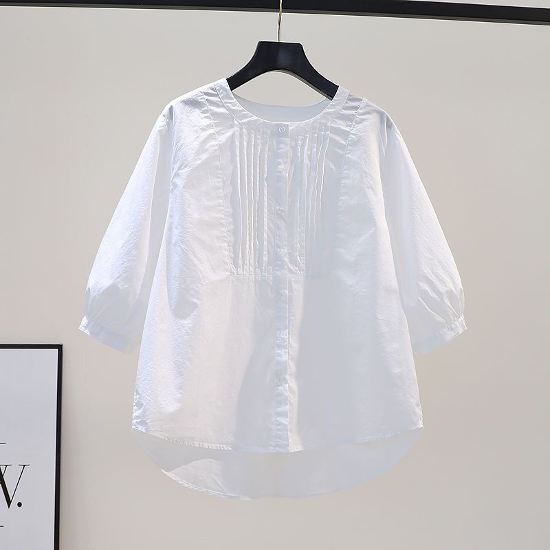 White Shirt Women’s 2024 Summer New Design Pleated Round Neck Half Sleeve Casual All-match Shirt Top