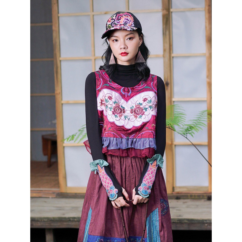 Real shot ethnic embroidery vintage vest short sleeveless top overalls waistcoat crew neck coat