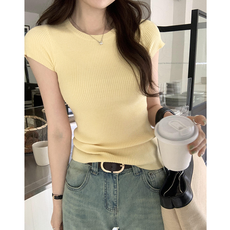Korean Style Simple Knitted Short-sleeved T-shirt Women’s Spring and Summer New Niche Design Sense Slim-fit All-match Solid Color Top