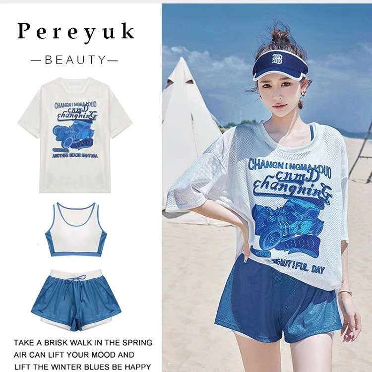 [High Street Travel] Swimsuit Women’s Sports Split Vest Three-Piece Set Conservative Slim Belly Covering Large Size Boxer Swimsuit