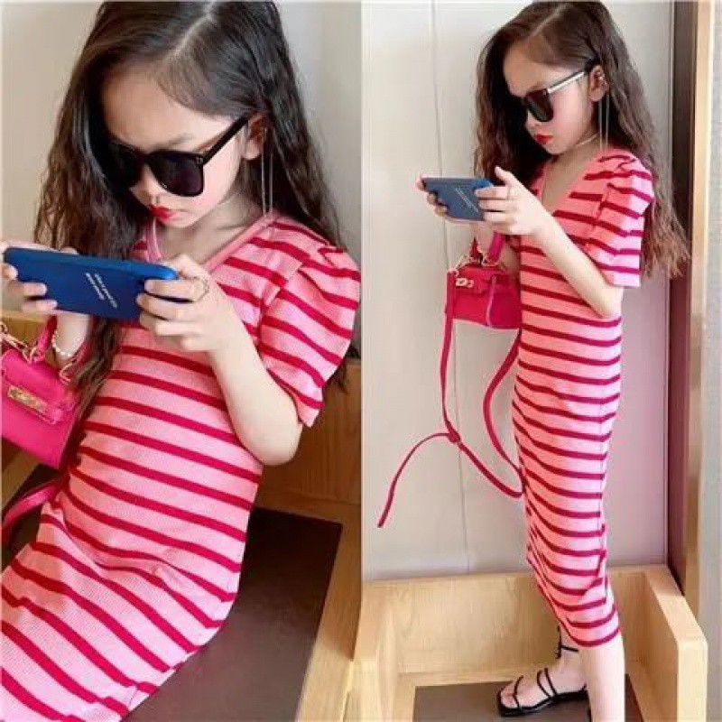 Girls’ Striped Hip Bag dress Western Style Summer Children’s Internet Popular Bubble Sleeve Mid-length Stretch Slim-fit Split Skirt