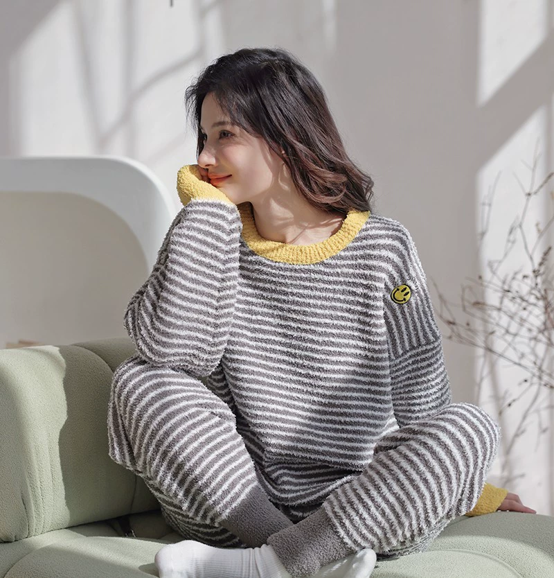 2023 New Pajamas for Women Autumn and Winter Coral Velvet Plus Velvet Thickened Stripes Cartoon Internet Celebrity Style Home Clothes Set
