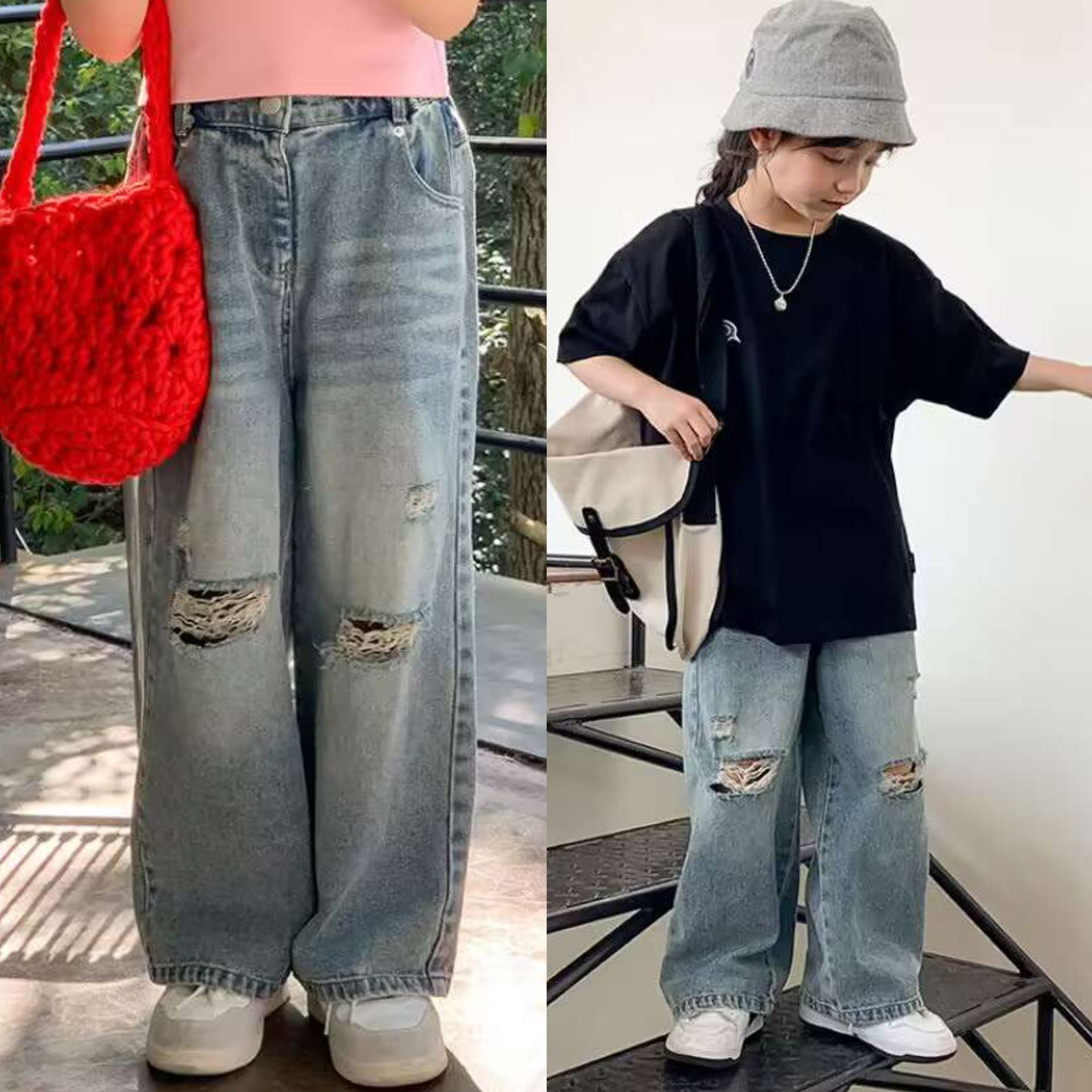 Girls’ ripped jeans cute play 2023 Summer Children’s mopping pants distressed straight pants high waist retro wide leg pants