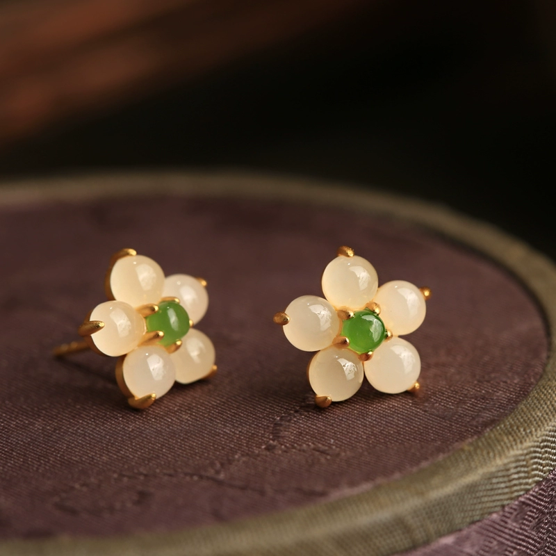 Hetian jade sterling silver earrings for women summer antique style peach blossom