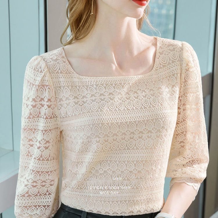 [48 hours delivery] lace bottoming shirt 2021 early spring new seven-point sleeve collar hollow temperament crochet