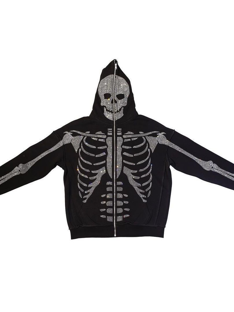 European and American hip hop cool street rhinestone long sleeve zipper hooded sweater skull Halloween men and women loose plus size coat