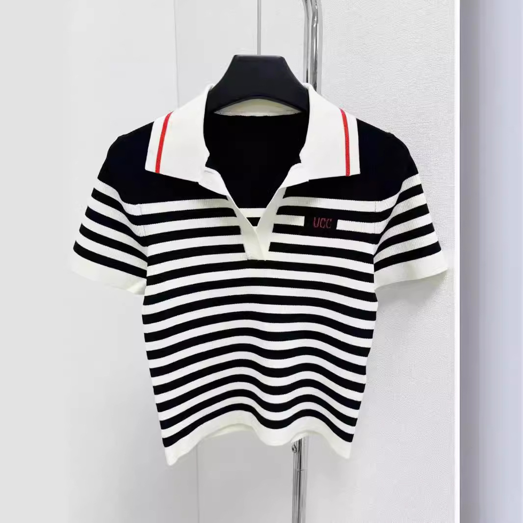 Women’s short sleeve polo collar striped contrast color sweater for women 2024 summer new fashion casual top