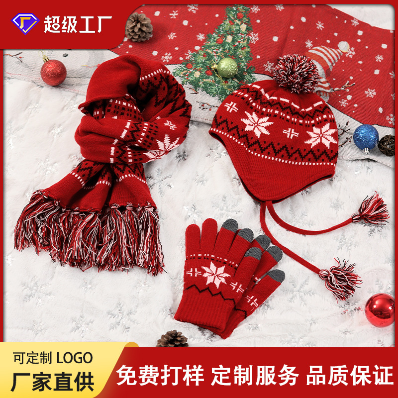 Winter cross-border snowflake knitted Christmas hat ear protection fur ball touch screen gloves scarf three-piece set Christmas suit in stock