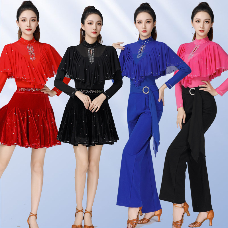 Square dance modern dance top new women’s diamond-embedded stand collar long-sleeved clothes elegant dance Latin dance clothes gitba clothes