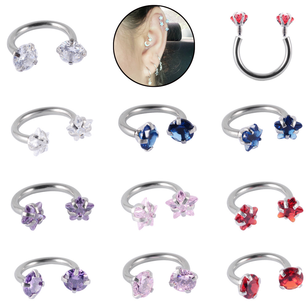 Cross-border C- shaped multi-color zircon lip ring stainless steel internal thread horseshoe nose ring U-shaped puncture internal tooth ear bone ring earrings