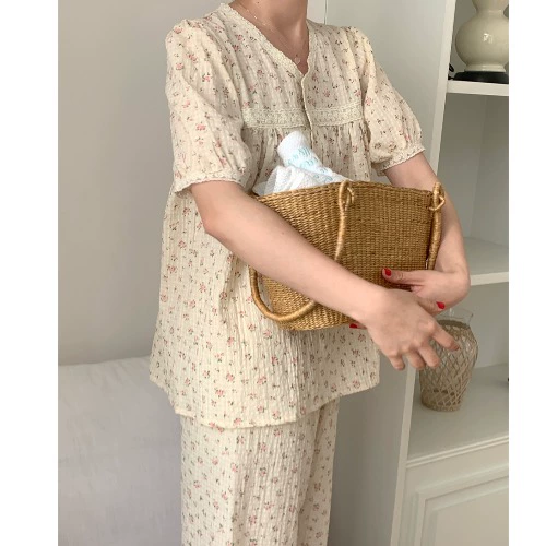 Pajamas for women summer short-sleeved trousers Korean style Japanese pastoral style small floral cotton and linen home clothes two-piece suit spring