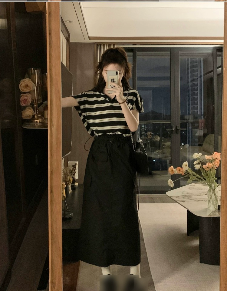 Large size striped POLO collar fat girl hip-hugging fashion suit