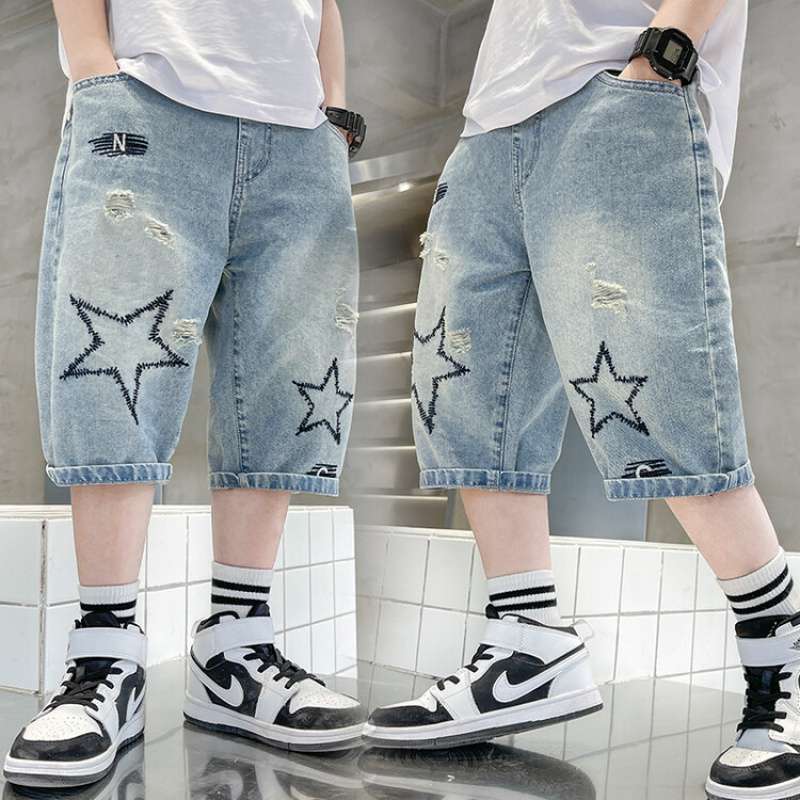 Children’s Denim Shorts Casual Summer Middle and Big Children’s Thin Loose Fashionable Shorts with Hole Handsome Fashionable Shorts