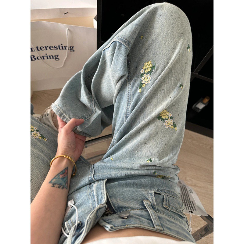 American Style Retro Old-fashioned Design Sense Flower Hot Drilling Jeans Women’s Spring and Summer Slimming High Waist Loose Straight Long Pants