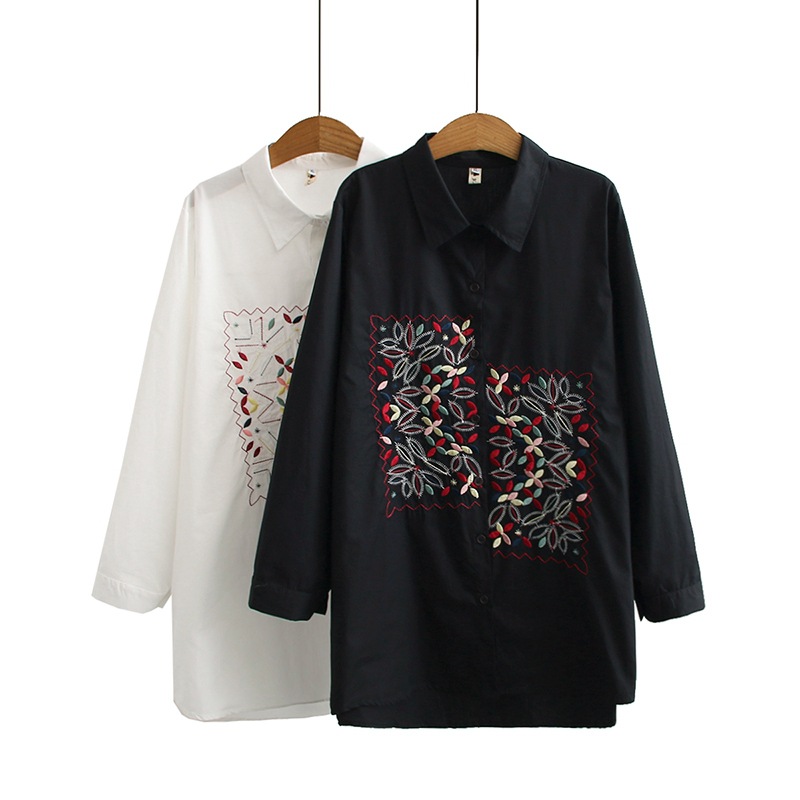 K91 large size women’s autumn new fat sister mm slim loose asymmetric embroidered shirt 9015