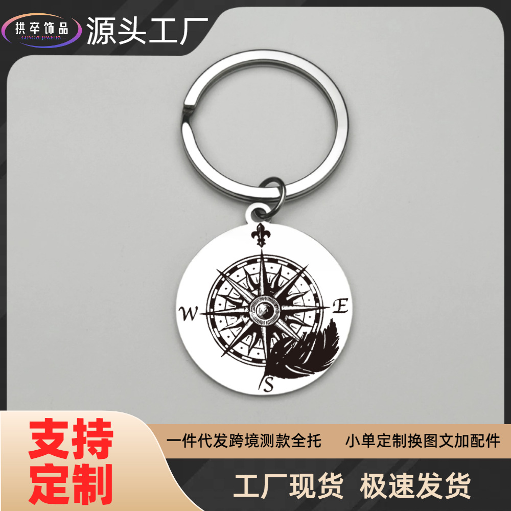 Cross-border compass refers to the north and south needle custom-made creative laser lettering with chain metal stainless steel keychain pendant
