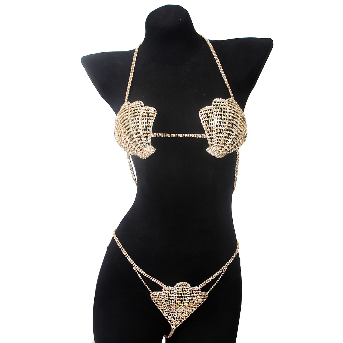 European and American Fashion Jewelry Exaggerated Shell Bikini Chain Sexy Rhinestone Chest Chain Nightclub Party Body Chain Set for Women
